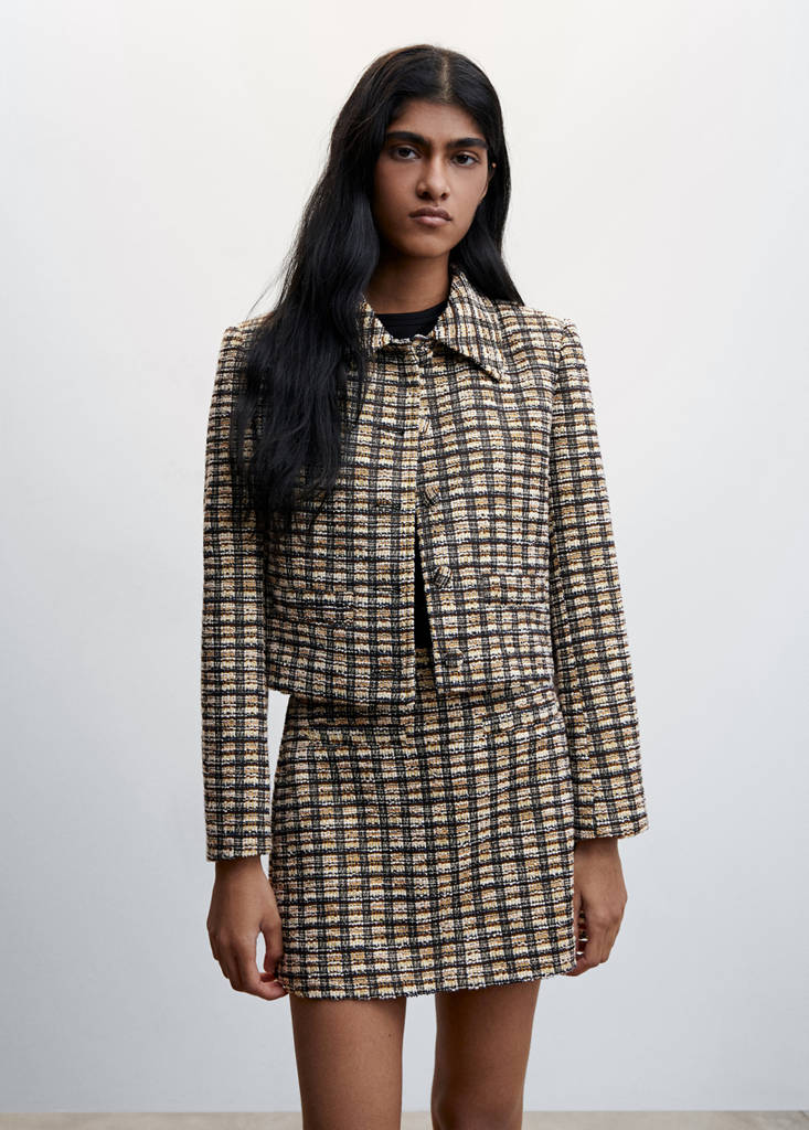 Tweed fabric. Check-pattern. Straight design. Short design. Button fastening on the front section. Long sleeve. Lapel-collar. Two zip pockets on the front. Co-ord