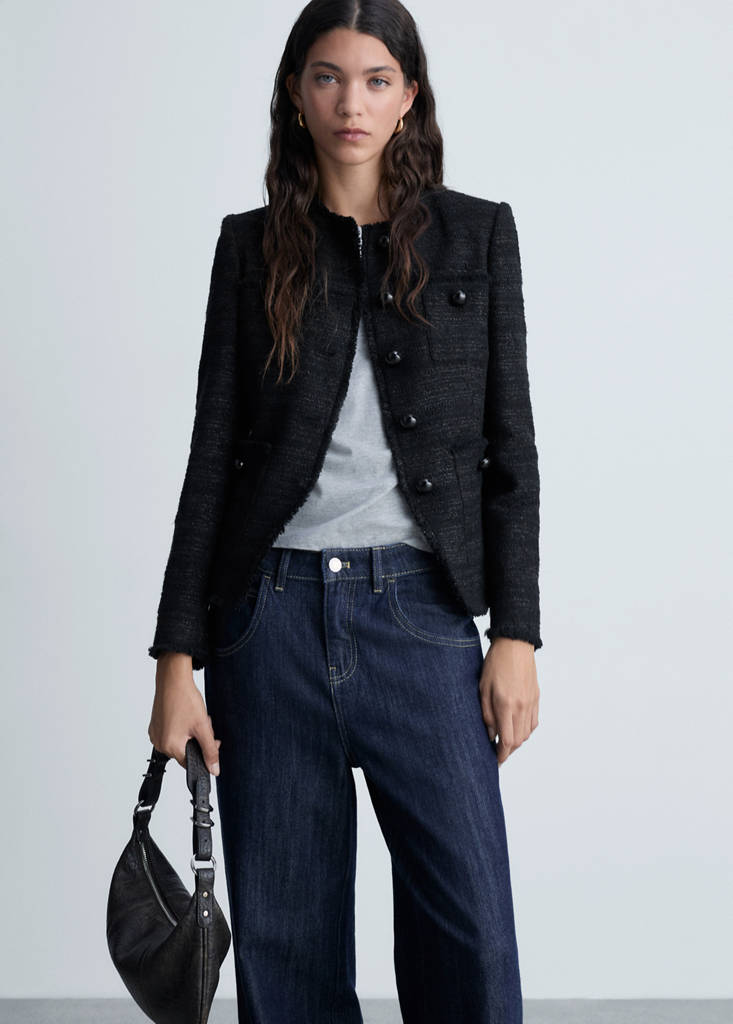 Tweed fabric. Cotton blend fabric. Standard design. Long sleeves. Round neck. Front closure with buttons. Four patch pockets on the front. Metallic buttons. Frayed finish. Lining only