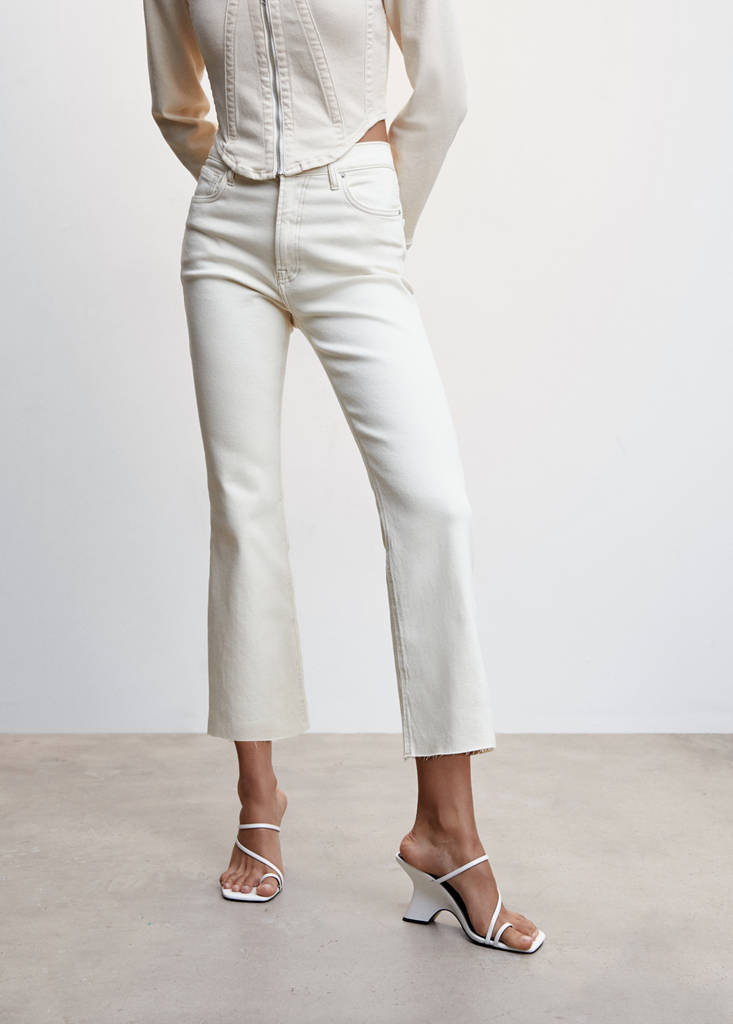 Denim-style cotton fabric. Recycled cotton-blend fabric. Stretch fabric. Flared design. Flare design. Crop design. Frayed hem. High waist. Belt loops. Five pockets. Zip and button fastening. Available Plus. Inseam 68 cm