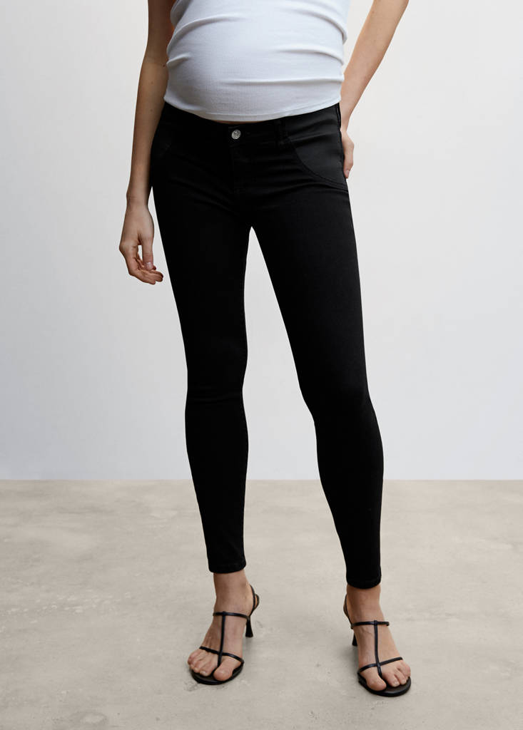 Denim style cotton fabric. Fitted design. Low waist. Loops. Two patch pockets on the back. Elastic waist. Zip and one button fastening. Inseam 74 cm. We recommend you buy your usual size. Comfort and freedom of movement. Maternity