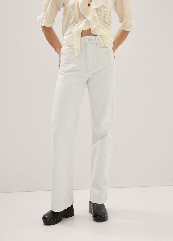 Denim style cotton fabric. Bootcut design. Cropped design. High waist. Adjustable tie. Loops. Two front pockets. Two patch pockets on the front. Double button and zip closure. Inseam 68 cm
