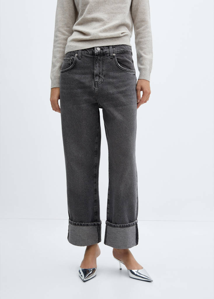 Denim style cotton fabric, wide-leg design, cropped design, medium waist, loops, five pockets, zip and one button fastening, rolled-up hem, inner length 63.5 cm.
