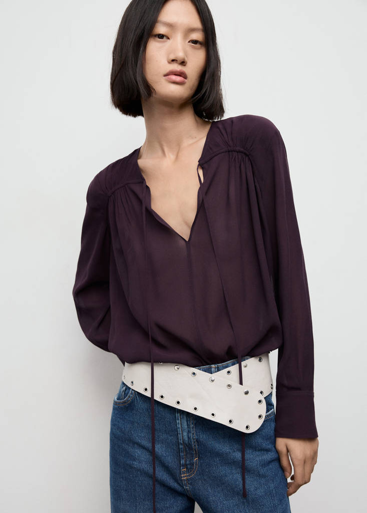 Chiffon blouse with bow necklineCurrent price [JPY 6,990 ]JPY 6,990Select a colourBurgundySelect your sizeXSSMLXLDimensionsAdd to WishlistSee lookFree delivery to storeCrafted from chiffon fabric, this garment features a straight design with a plunging neckline. The neckline is adorned with a bow closure, while the long sleeves have buttoned cuffsDetails, composition and careStore availability