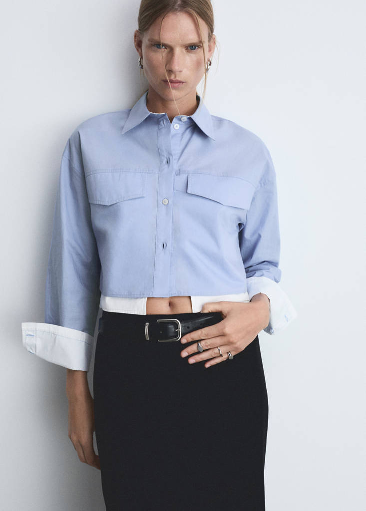 Cotton poplin. Crop design. Straight design. Combined design. Shirt collar. Long sleeves with buttoned cuffs. Two front flap pockets. Contrasting finishes. 100% cotton fabric. Front closure with buttons