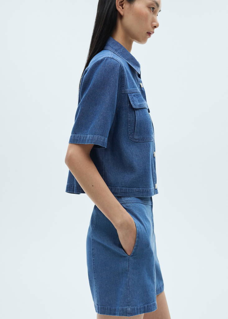 Medium. 100% Cotton. Denim-style cotton fabric. Front closure. Standard design. Straight design. Shirt collar. Short sleeves. Two patch pockets on the chest. Front closure with metal buttons