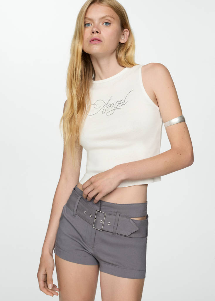 Low waist. Short design. Belt loops. Concealed button, hook and zip fastening. Opening detail. Decorative belt. Fitted design