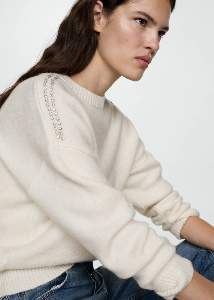 Knitted sweater with glitter detailCurrent price [JPY 9,990 ]JPY 9,990Select a colourWhiteSelect your sizeSMLDimensionsAdd to WishlistSee lookFree delivery to storeMedium knit fabric. Straight design. Round neck. Long sleeves. Crystal details in the shoulders. Lace finish. No FasteningDetails, composition and careStore availability