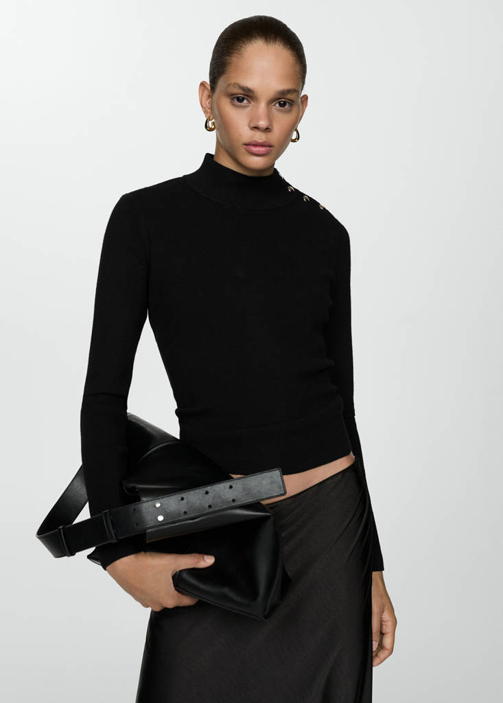 Sweater with shoulder buttonsCurrent price [JPY 5,990 ]JPY 5,990Select a colourBlackThe model is wearing size S and is 180cm tall.Select your sizeXSSMLXLDimensionsAdd to WishlistSee lookFree delivery to storeFine knit fabric. Straight design. High collar. Long sleeves. Decorative buttons on the shoulders. Available in plain and patternedDetails, composition and careStore availability
