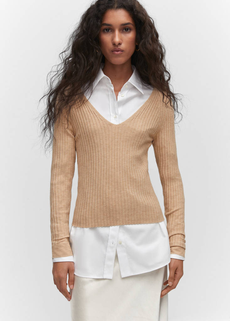 Fine knit fabric. Ribbed knit fabric. V-neck. Long sleeves. No Fastening. Office looks. Fitted design