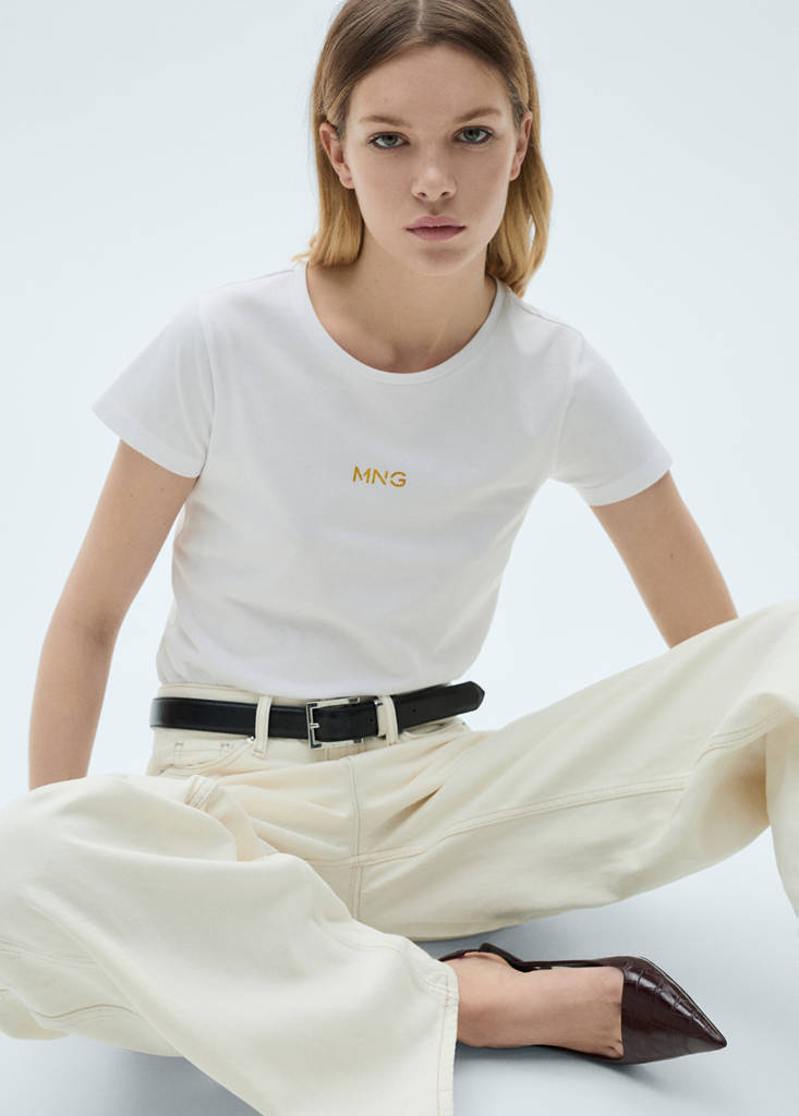 Logo cotton T-shirtCurrent price [JPY 1,490 ]JPY 1,490Select a colourWhiteThe model is wearing size S and is 176cm tall.Select your sizeXSSMLXLXXLDimensionsAdd to WishlistSee lookFree delivery to storeShort sleeves. Mango logo print. Straight design. Round neck. T-shirt. Logo print. 100% cotton fabric. No Fastening. Fitted designDetails, composition and careStore availabilityItem qualitiesRecycled cottonAt least 20%This fibre is obtained from pre- and post-consumer textile waste that is transformed into new fabrics.