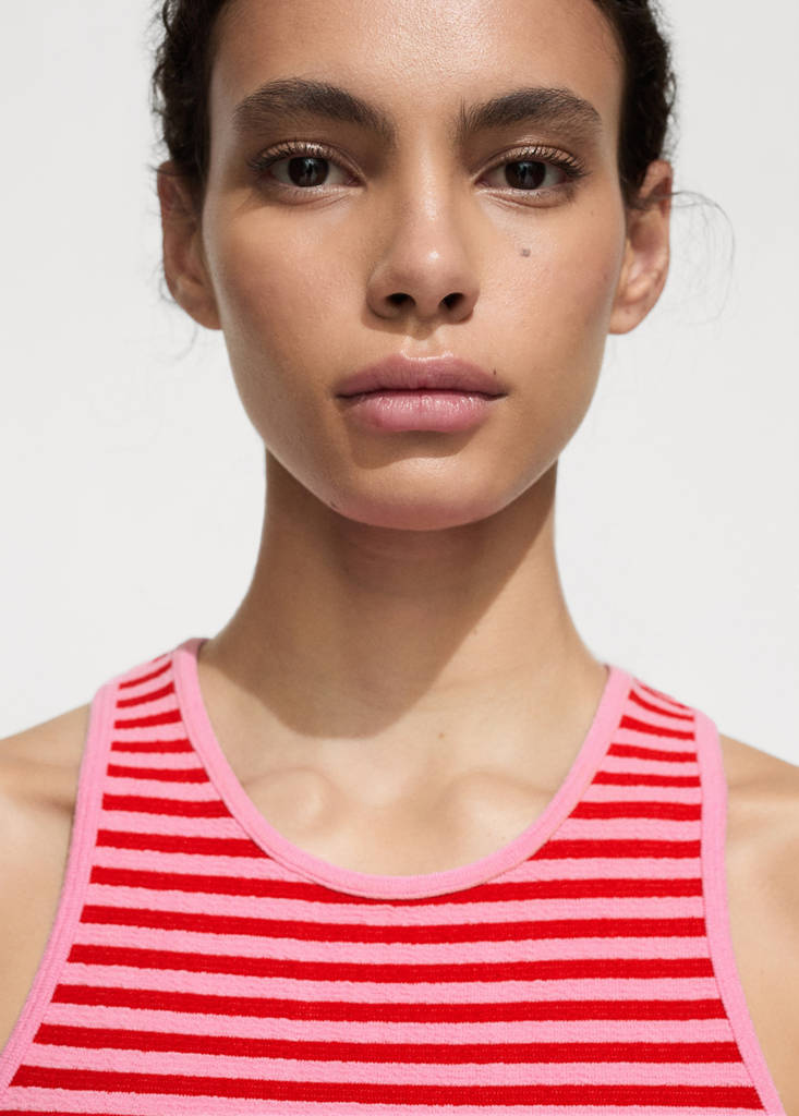 Striped knit topCurrent price [JPY 2,990 ]JPY 2,990Select a colourRedSelect your sizeXSSMLXLDimensionsAdd to WishlistSee lookFree delivery to storeKnit fabric. Crop design. Striped print. Round neck. Sleeveless. Festival Season. Fitted designDetails, composition and careStore availability