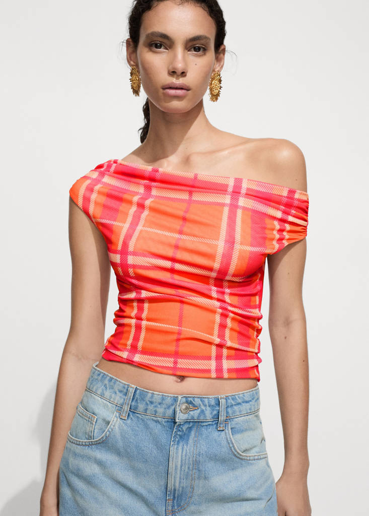 Stretch fabric. Crop design. Checked print. Boat neckline. Short sleeves. No Fastening. Festival Season. Fitted design
