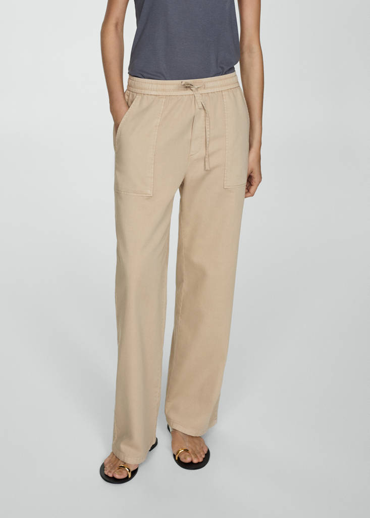 Straight design. Long design. Mid-rise. Two front pockets. Two patch pockets at the back. Tie fastening. Stitching detail. 100% cotton fabric. Denim-style cotton fabric. Two side pockets. Elastic waist with tie closure