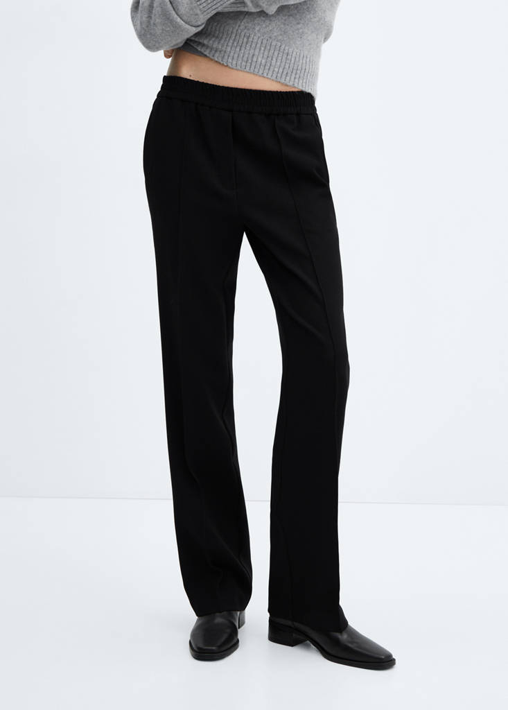Straight design. Two side pockets. Mid-rise. No Fastening. Elasticated waistband. Decorative seams. Inner lining