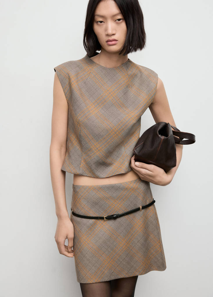 Топ облегающего кроя с принтом в клетку, с круглым вырезом и короткими рукавами. Застежка на молнию сзади обеспечивает удобную посадку. В комплект входит соответствующая юбка в тон