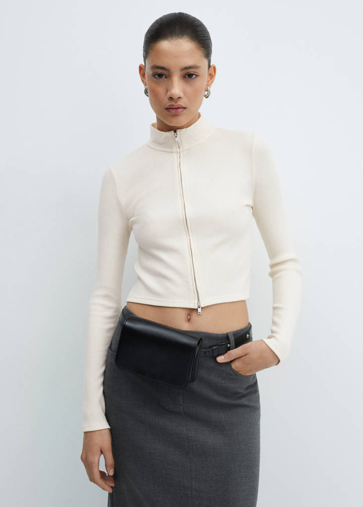 Тонкий трикотаж. Ребристая вязка. Кроп-дизайн. Воротник перкинс. Длинные рукава. Спереди застежка на молнию. Приталенный дизайн.