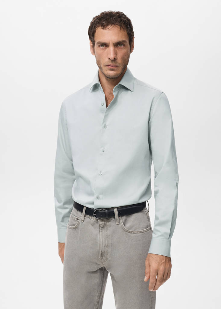 Slim fit. Cotton and lyocell blend fabric. Shirt collar. Long sleeves with buttoned cuffs. Front closure with buttons. Rounded base