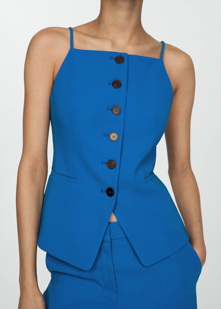 Halter-neck gilet with buttonsCurrent price [US$ 59.90 ]US$ 59.90Select a colourBlueThe model is wearing size S and is 176cm tall.Select your sizeXXSNot available. I want it!XSNot available. I want it!SNot available. I want it!MNot available. I want it!LNot available. I want it!XLNot available. I want it!XXLNot available. I want it!Notify meAdd to WishlistSee lookFree delivery to storeHalter neck. Sleeveless. Thin straps. Two front welt pockets. Inner lining. Front closure with buttons. Fitted designDetails, composition and careStore availability