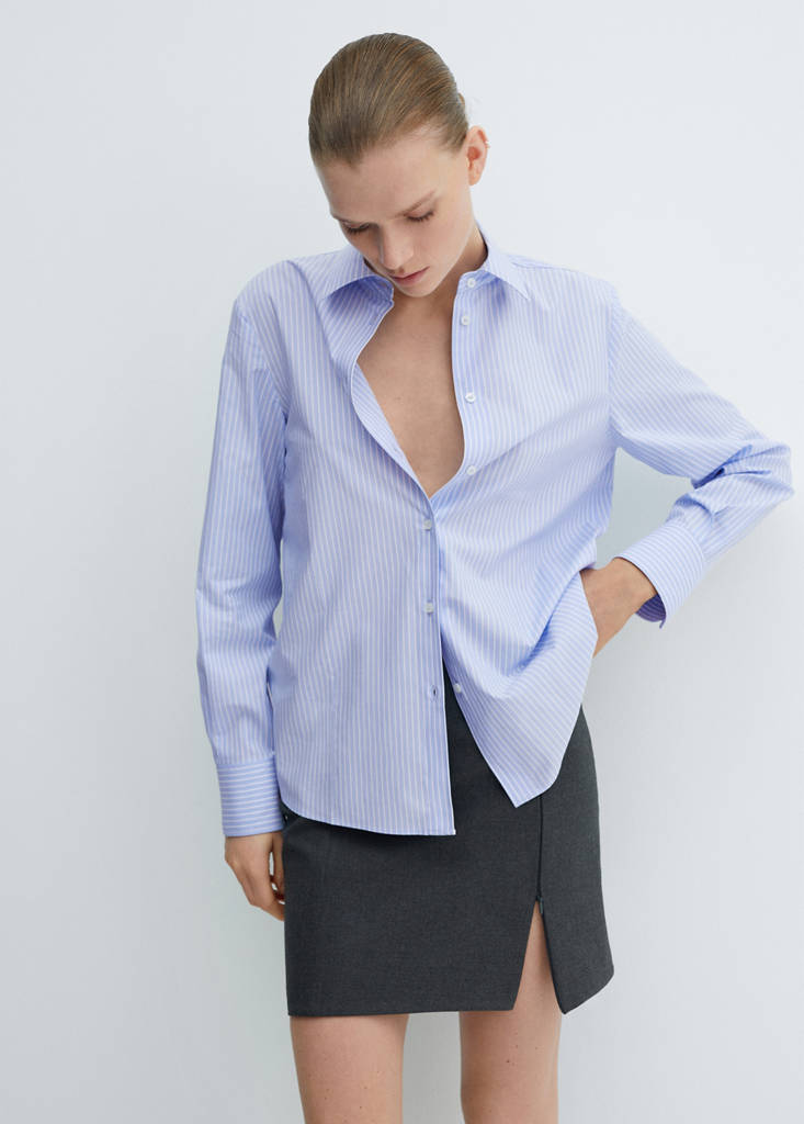 Cotton and lyocell blend fabric. Long design. Suit style. Shirt collar. Chest pocket. Long sleeves with buttoned cuffs. Button fastening at the front. Available in plain and patterned. Striped print. Fits bigger to size. Available Plus. Office looks