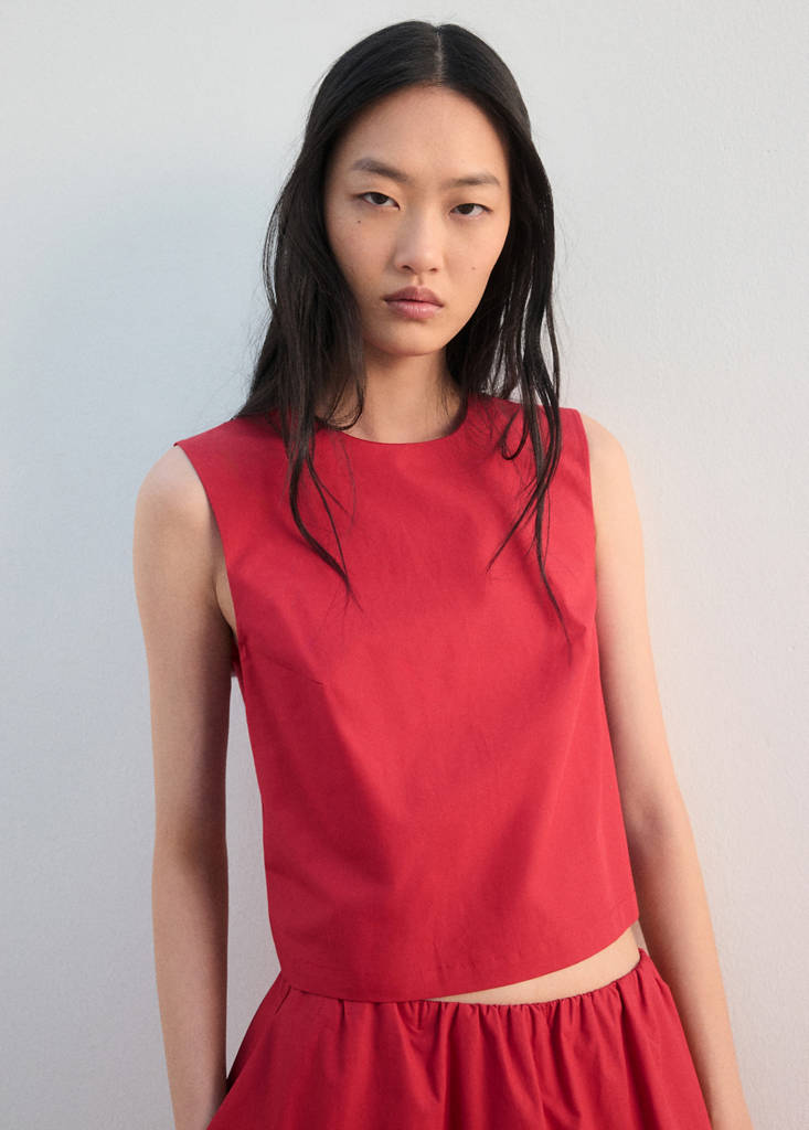 Buttoned crop topCurrent price [US$ 39.90 ]US$ 39.90Select a colourRedThe model is wearing size S and is 177cm tall.Select your sizeXSSNot available. I want it!MNot available. I want it!LNot available. I want it!XLNot available. I want it!DimensionsAddAdd to your wishlistSee lookFree delivery to store100% cotton fabric. Straight design. Crop design. Round neck. Sleeveless. Wide strap. Button fastening on the back section. Total lookDetails, composition and careStore availabilityItem qualitiesRecycled cottonAt least 20%This fibre is obtained from pre- and post-consumer textile waste that is transformed into new fabrics.