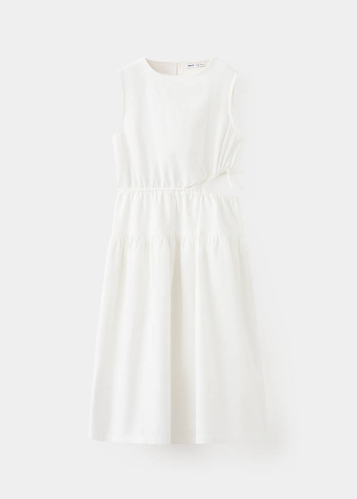 Cotton and linen blend fabric. A-line design. Short design. Round neck. Straps. Gathered panel at the waist. Side slit