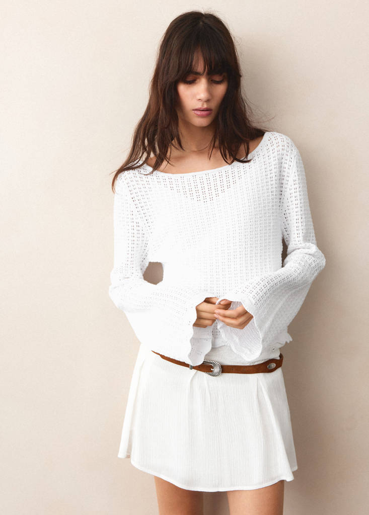 100% cotton fabric. Ribbed knit fabric. Straight design. Round neck. Long sleeves. Scalloped edges