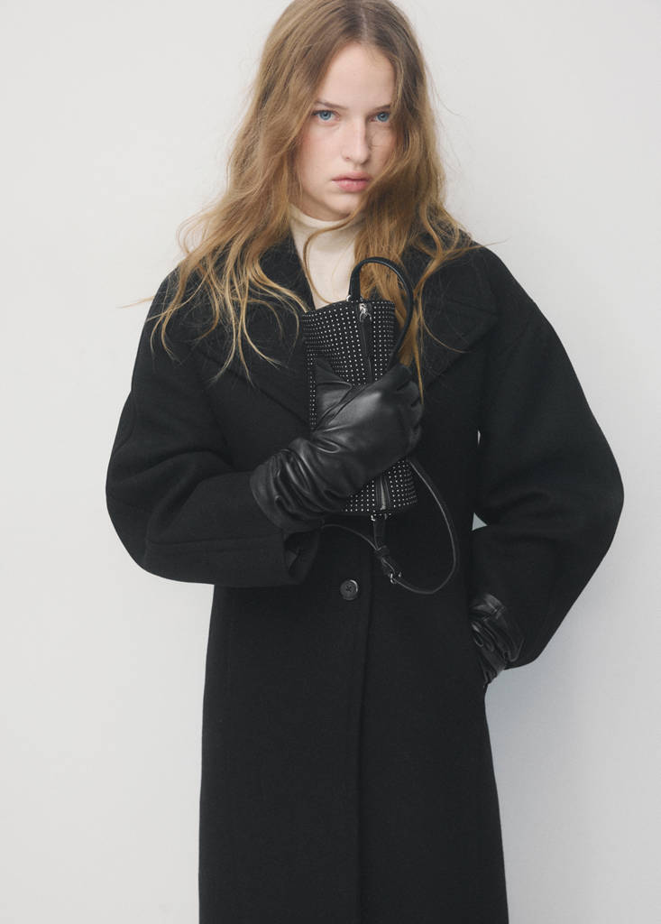 Small size. Suede faux-leather. Oval design. Shoulder strap. Stud detail. Handle with adjustable buckle. Zip closure