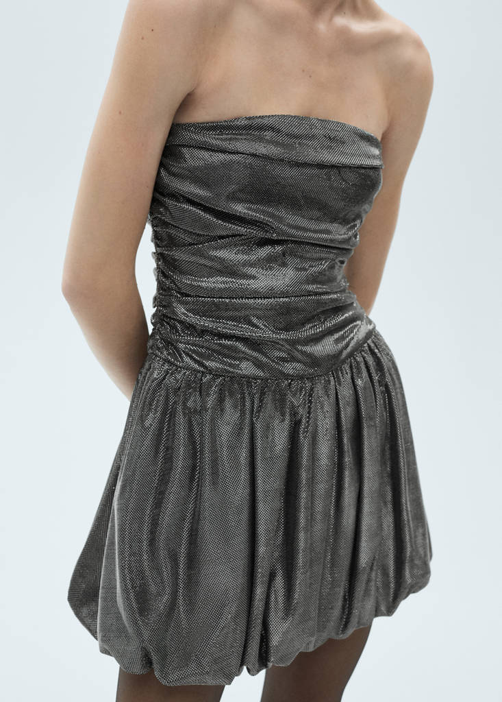 Bubble hem. Sparkled fabric. Fitted design. Shaved design. Bubble hem. Short design. Strapless. Sleeveless. Zip fastening on the back section. Inner lining. Party, ceremony and communion collection
