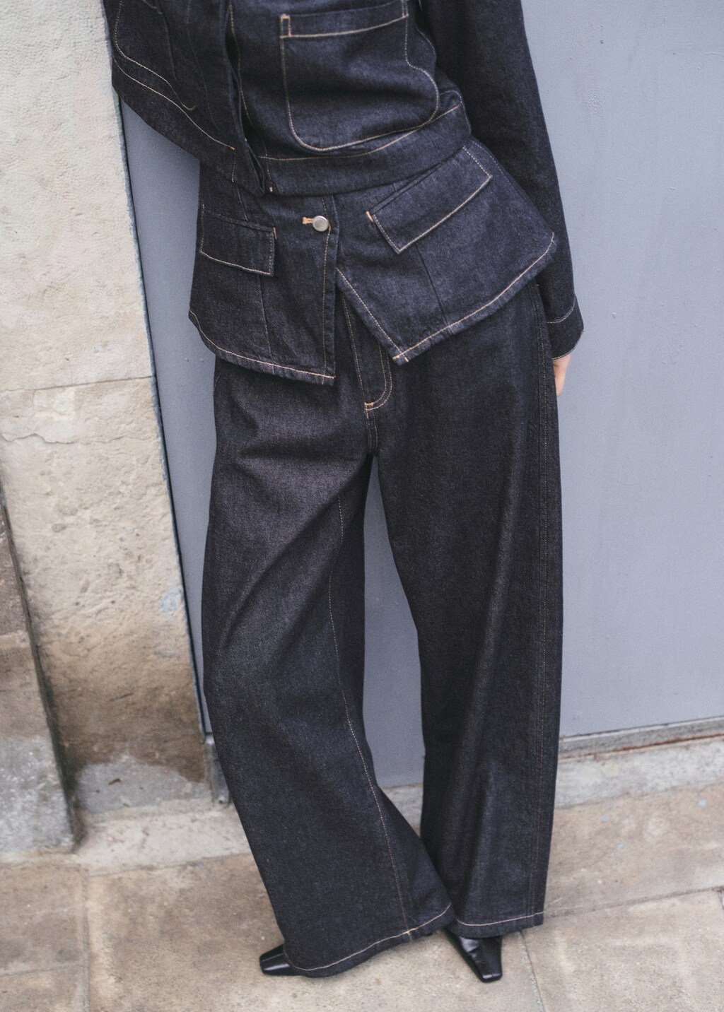 데님 스타일 면 원단. 롱 디자인. 벌룬 디자인. 중간 허리. 벨트 고리. 파이브 포켓. 앞면의 지퍼와 버튼 클로저. 토탈 룩.