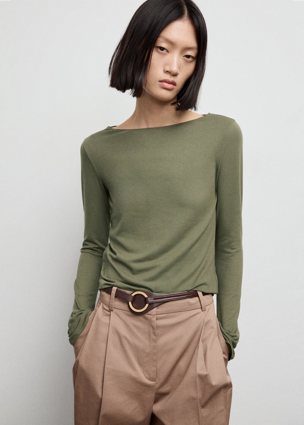 بتصميم ضيق، تتميز هذه القطعة بياقة قارب وأكمام طويلة واسعة. متوفرة بمقاسات Plus