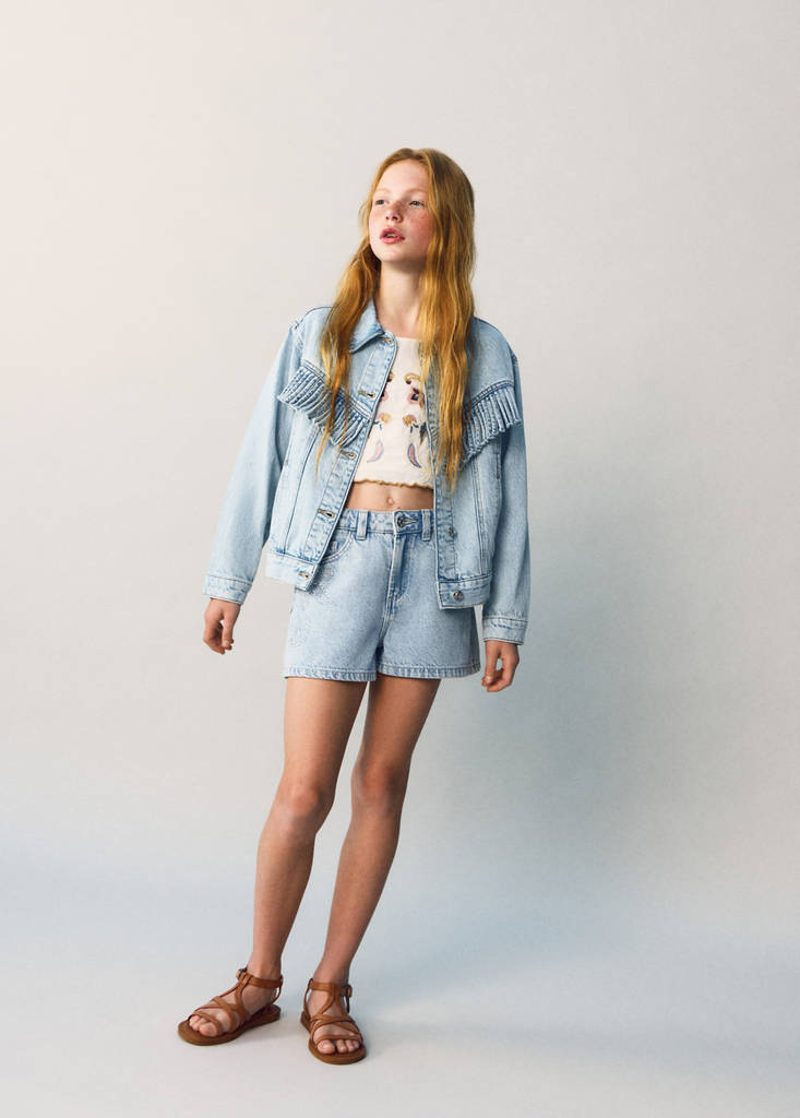 قماش قطن بأسلوب جينز. تصميم مستقيم. ياقة قميص. أكمام طويلة مع أساور بأزرار. إغلاق أمامي بأزرار معدنية. تفاصيل الشراشيب