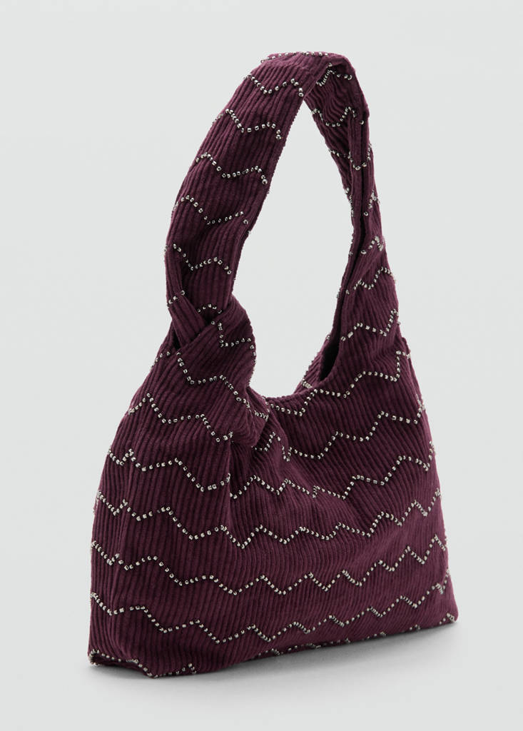 نسيج ثقيل. تقسيمة مخرزة. عقدة فضفاضة. إغلاق بزر معدني. مقبض قصير