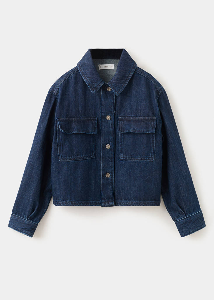 Модель прямого кроя из хлопковой ткани в джинсовом стиле с рубашечным воротником, длинными рукавами, двумя накладными карманами на груди и застежкой на пуговицы спереди