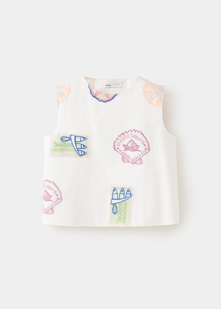 Модель прямого кроя из смеси хлопка и льна с круглым воротником и бретелями. Вышивка придает изделию особый акцент