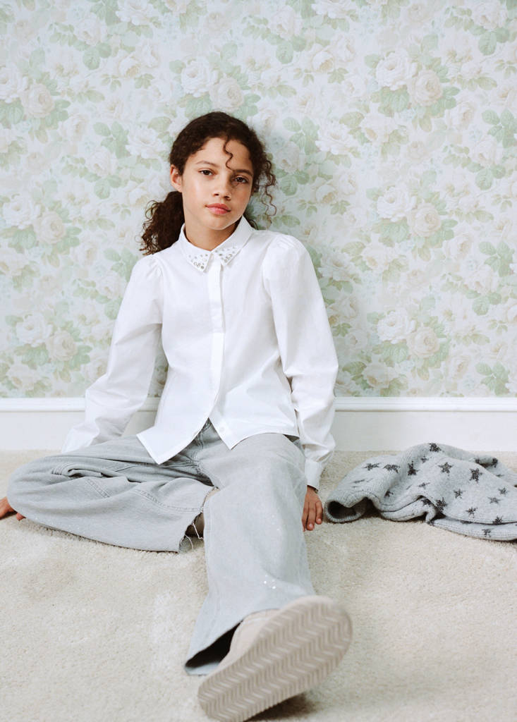 Изделие прямого кроя из 100% хлопка с рубашечным воротником, украшенным бисером. Длинные рукава со сборками и манжетами на пуговицах. Застежка на пуговицы спереди