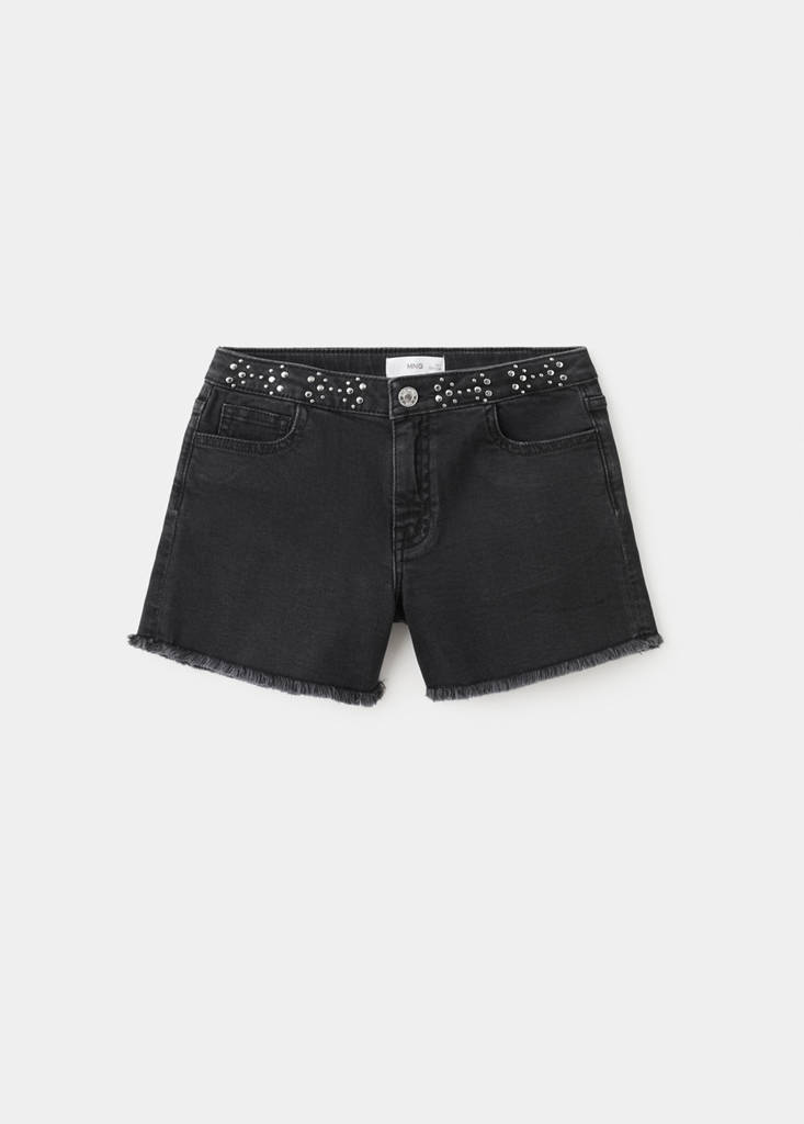 Хлопковая ткань в стиле джинсовой ткани. Короткая длина. Деталь с заклепками. Средняя посадка. Необработанные края с торчащими нитками. Пять карманов. Застежка на пуговицу и молнию.