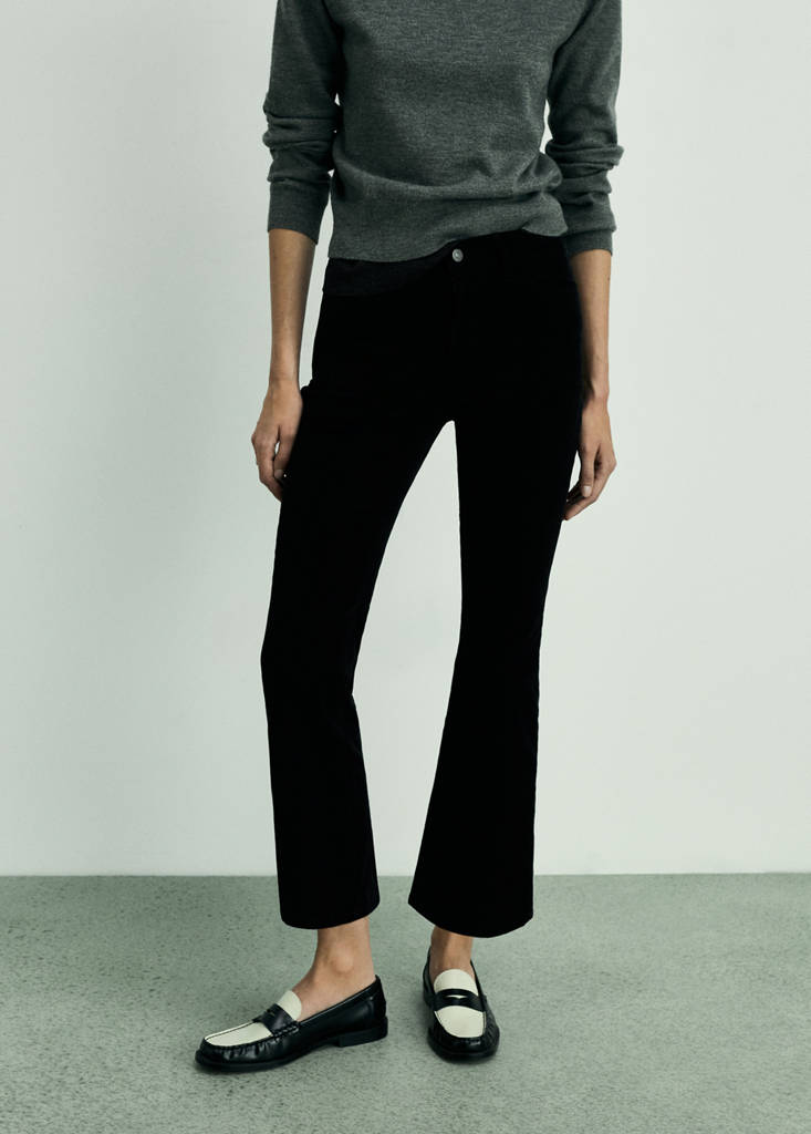 Вельвет. Хлопковая ткань. Эластичная ткань. Стиль клёш. Укороченный фасон boot. Высокая посадка. Шлёвки. Пять карманов. Застежка-молния и пуговица. Внутренняя длина 65 см. Расклешенный фасон.