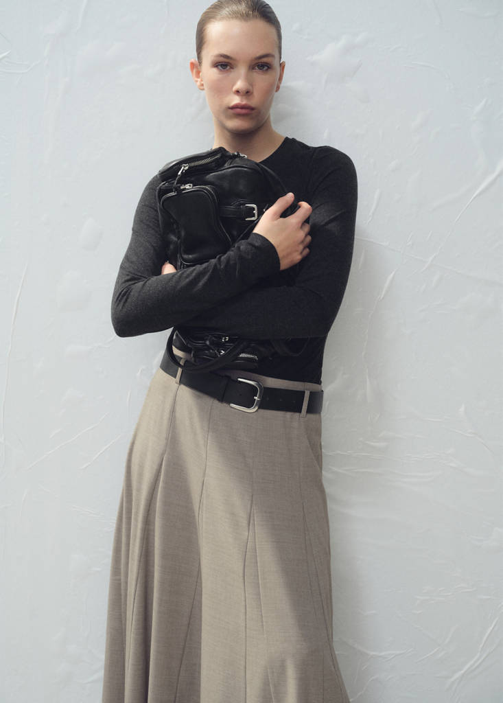 Длинный дизайн. Дизайн трапеция. Фасон годе. Пояс с застежкой на пряжку. Шлёвки. Средняя посадка. Внутренняя подкладка.