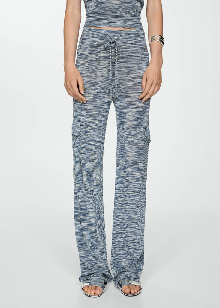 Тонкий трикотаж. Средняя посадка. Длинный дизайн. Прямой крой. Два кармана в грузовом стиле. Эластичный пояс с завязками. Total look