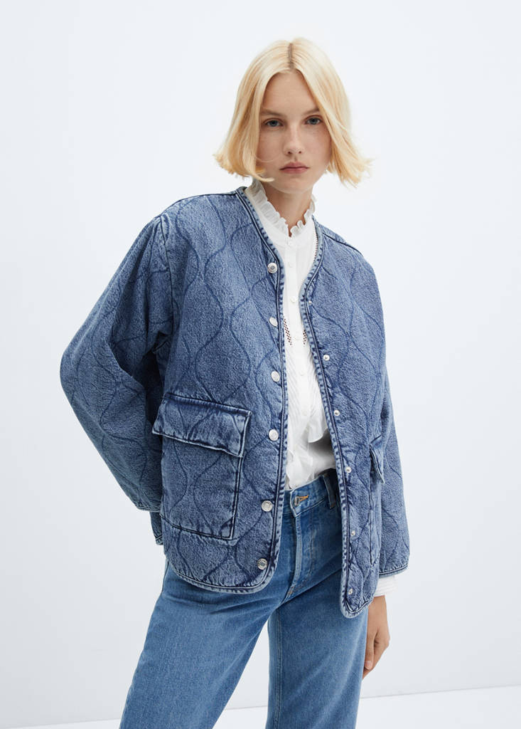 Хлопковая ткань в стиле джинсовой ткани. Прямой крой. Стеганый дизайн. Круглый вырез. Длинные рукава. Два кармана с клапанами спереди. Декоративные строчки. Подкладка. Доступно Plus. Передняя застежка на пуговицы
