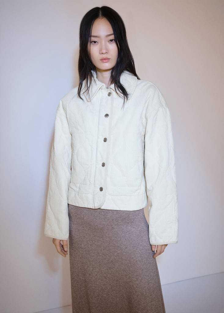 Стеганый дизайн. Фасон бомбер. Оверсайз дизайн. Рубашечный воротник. Спереди застежка на молнию. Длинные рукава. Вельвет