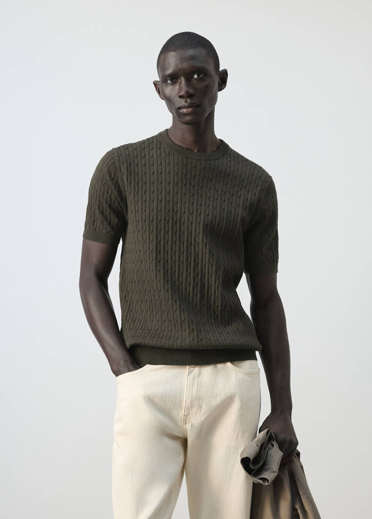 ESSENTIALS: Сделано, чтобы служить долго. 100% хлопок. Тонкая трикотажная ткань с рельефным микроузором в виде кос. Slim fit. Круглый вырез. Короткий рукав. Воротник, манжеты и низ с отделкой в рубчик. Коллекция Casper Ruud x Mango.
