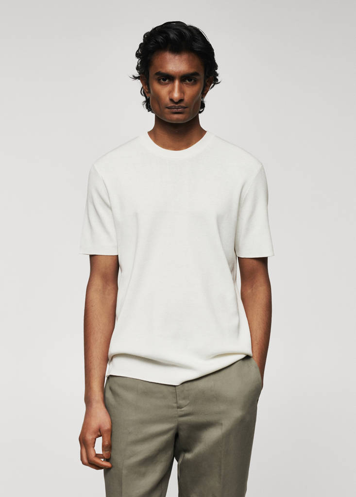 Прямой крой. Slim fit. Тонкий трикотаж. Эластичная отделка. Круглый вырез. Короткий рукав. Прямой крой. Стандартный дизайн. Кампания Антуан Гризманн. Эластичные края в рубчик. Прямой низ