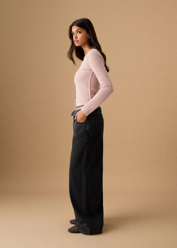 Хлопковая ткань. Длинный дизайн. Фасон wideleg. Низкая посадка. Пояс с отворотом. Застежка на пуговицу и молнию. Два боковых кармана. Два накладных кармана сзади.