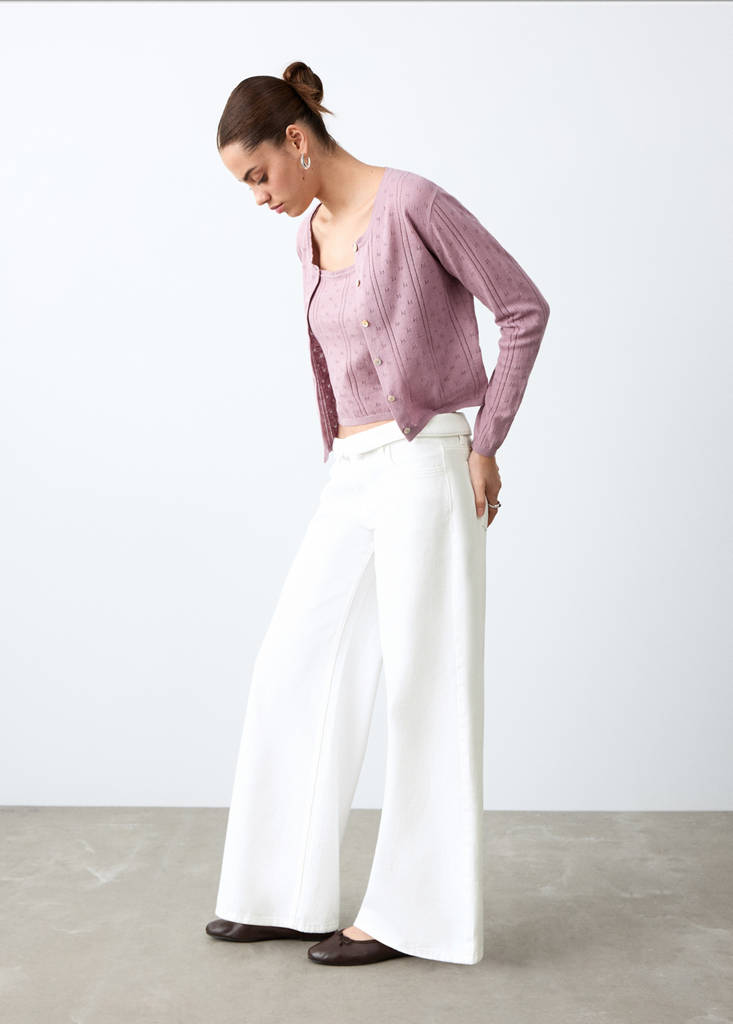 Хлопковая ткань. Длинный дизайн. Фасон wideleg. Низкая посадка. Пояс с отворотом. Застежка на пуговицу и молнию. Два боковых кармана.
