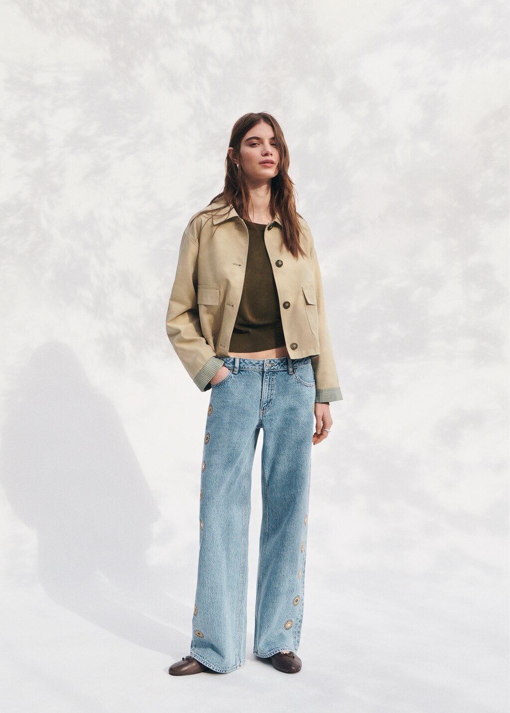 Джинсовая ткань из хлопка. Прямой крой. Длинный дизайн. Посадка на талии. Шлевки для ремня. Пять карманов. Застежка на пуговицу и молнию. Вышивка в виде солнца.