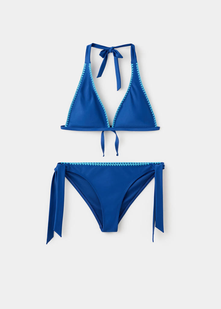 Комплект бикини. Эластичная ткань. Двухцветный дизайн. Треугольный силуэт. Вышитые детали. Регулируемые завязки. Регулируемый пояс. Съемные вкладыши. Классические трусики. Пляжная коллекция.