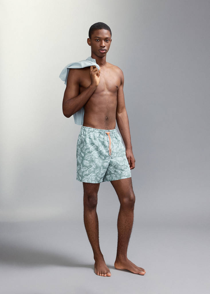 Прямой крой. Короткая длина. Принт с пальмами. Эластичный пояс со шнуром. Задний карман. Пляжная коллекция.