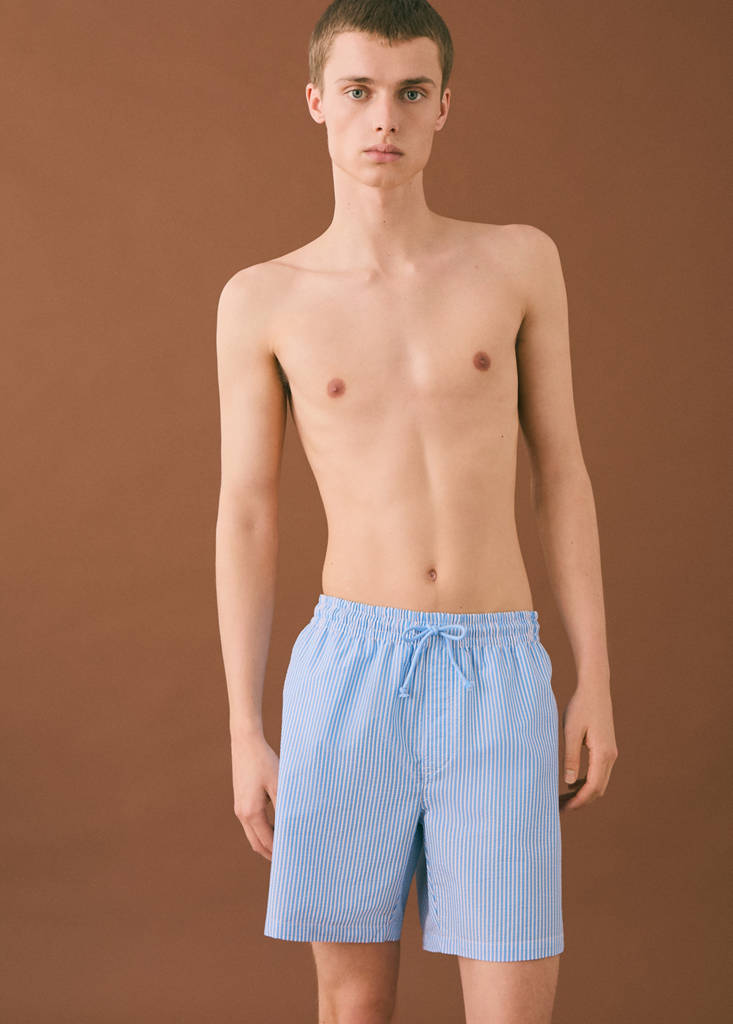 Хлопковая ткань. Принт в полоску. Прямой крой. Короткий дизайн. Эластичный пояс со шнуром. Накладной карман
