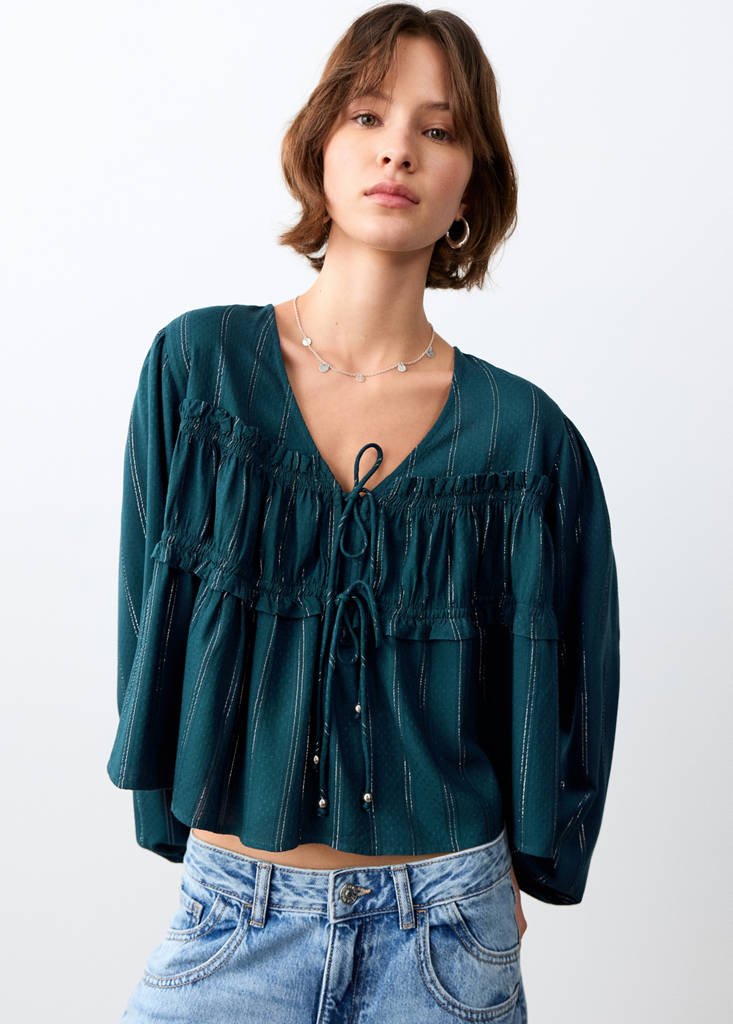 Текучая ткань. Ткань с люрексом. Прямой крой. V-образный вырез. Длинные рукава с эластичными манжетами. Деталь с воланами. С завязками.